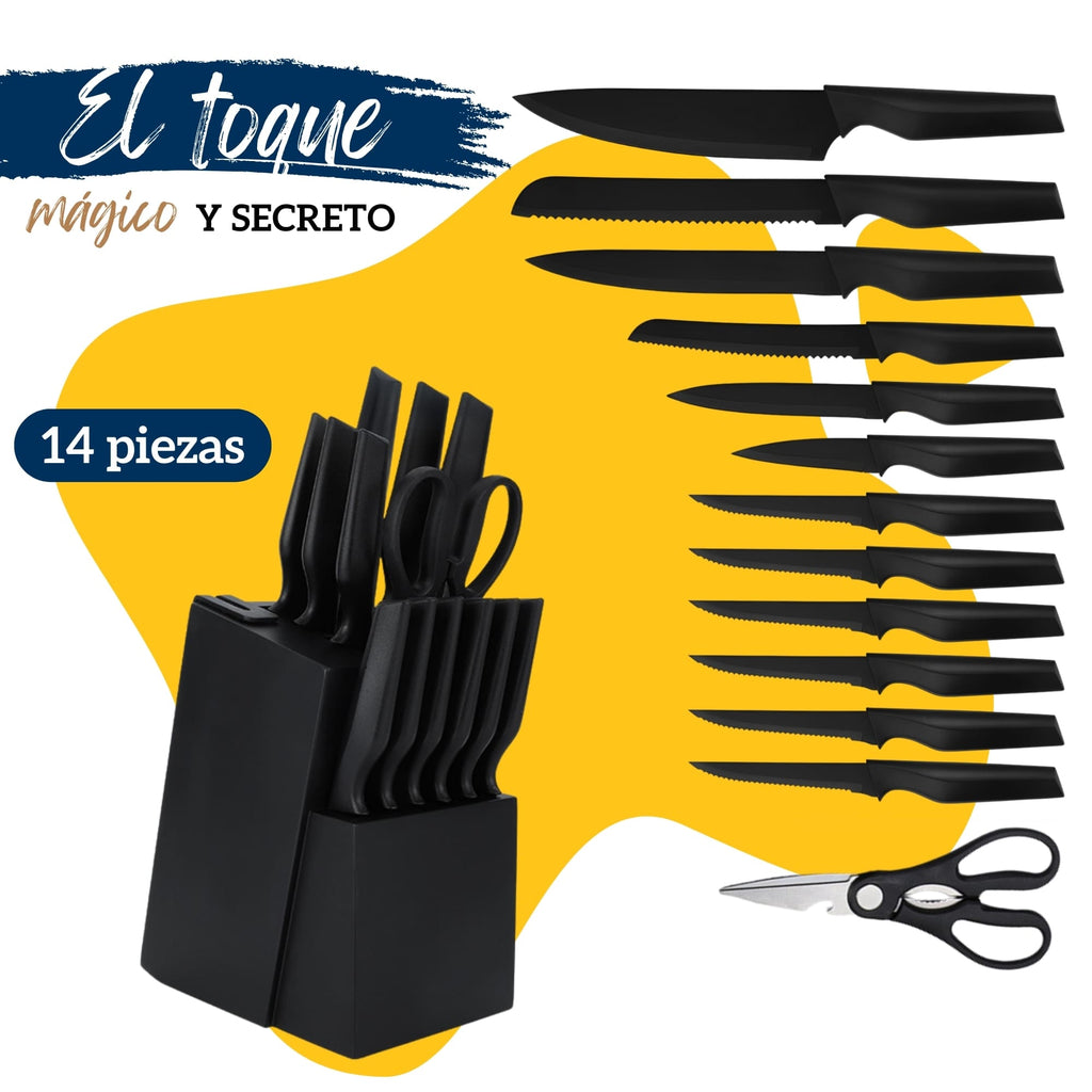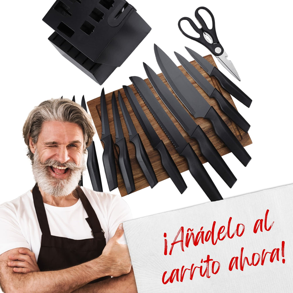Contenido: 1 Bloque de madera con afilador, 1 Cuchillo Chef, 1 Cuchillo Filetero, 1 Cuchillo para Pan (Largo), 1 Cuchillo para Pan (Auxiliar), 1 Cuchillo Multiusos, 1 Cuchillo Pelador, 6 Cuchillos para Carne, 1 Tijeras de Cocina.
