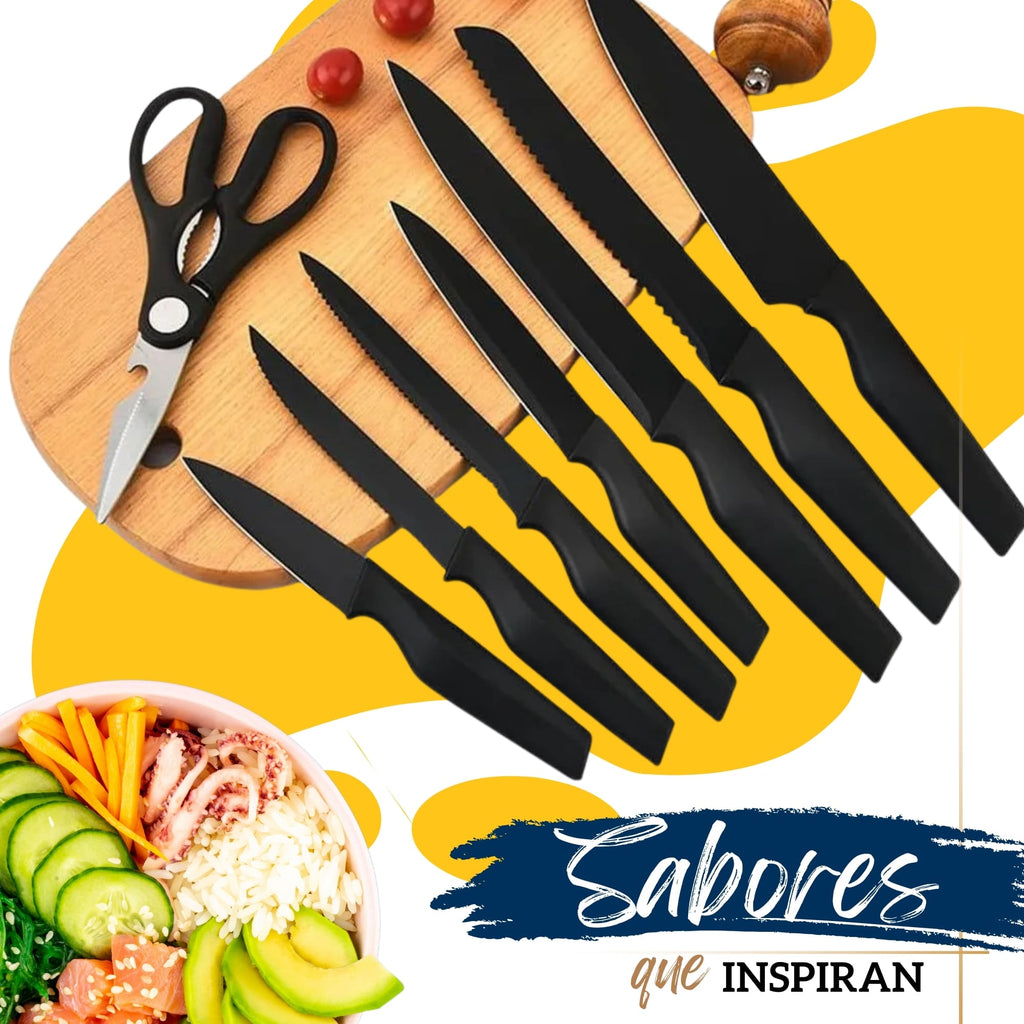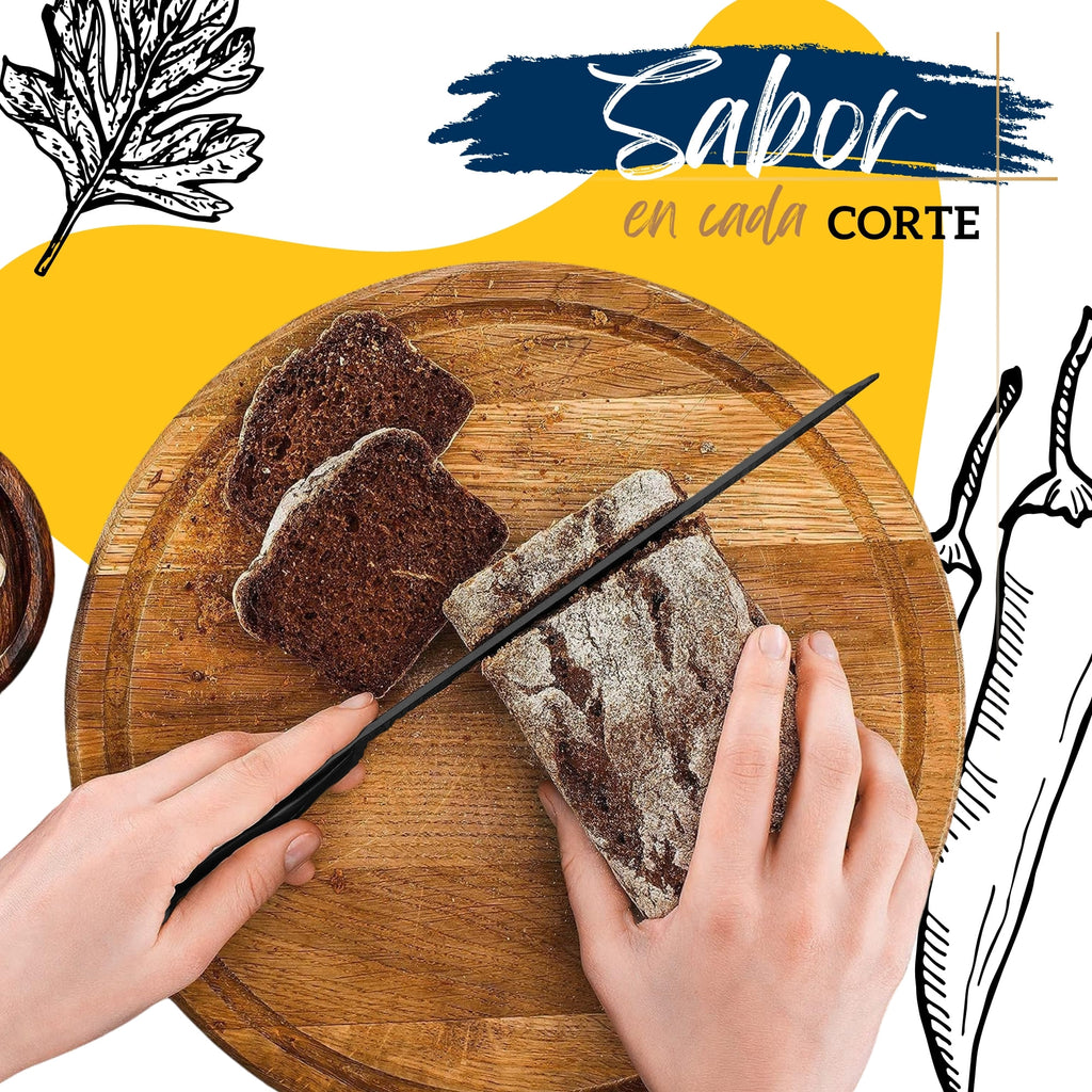 Hojas de Acero Inoxidable con Alto Carbono: Cada pieza está fabricada en acero inoxidable reforzado con alto carbono, lo que mejora la retención del borde y aumenta la resistencia al desgaste. Cuentan con un recubrimiento negro que actúa como barrera contra la oxidación y reduce la adherencia de los alimentos a la hoja durante el corte.