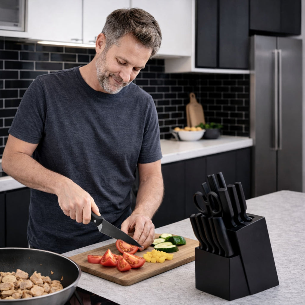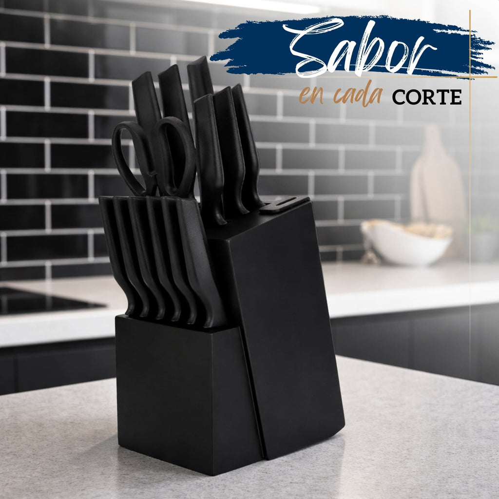 Limpieza: Aunque las piezas son resistentes, se recomienda el lavado manual y el secado inmediato antes de colocarlos en el bloque de madera. Esto preserva el recubrimiento y prolonga la vida útil del acero.
